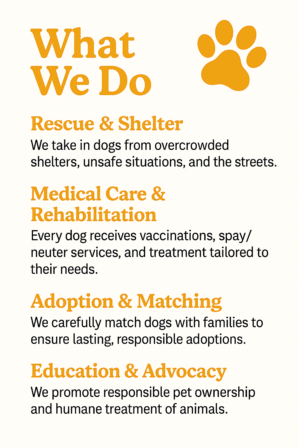 We exist to save dogs from neglect, abuse, and homelessnessāand to guide them toward healthy, happy lives with families who will love them forever. We donāt just rescue dogs; we rebuild trust, health, and hope. Every dog in our care receives individualized attention, medical support, and the time they need to recover physically and emotionally before being matched with a responsible, loving home.
